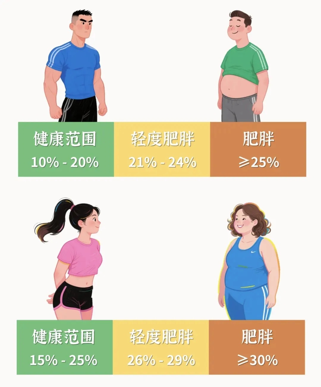 体脂率,就是脂肪在总体重中所占的比例。体脂率过高,会增加患心血管疾病、糖尿病等慢性病风险。