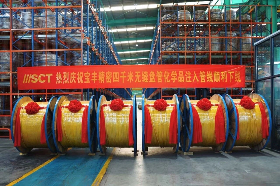 此次下线的超长盘管,单根长度达4050米、外径9.53毫米、壁厚1.65毫米,表面铠装TPV防护层,可在300℃高温环境下长期承受15000PSI工作压力,相当于将一辆小汽车压在一个指甲盖大小的面积上所产生的压强。