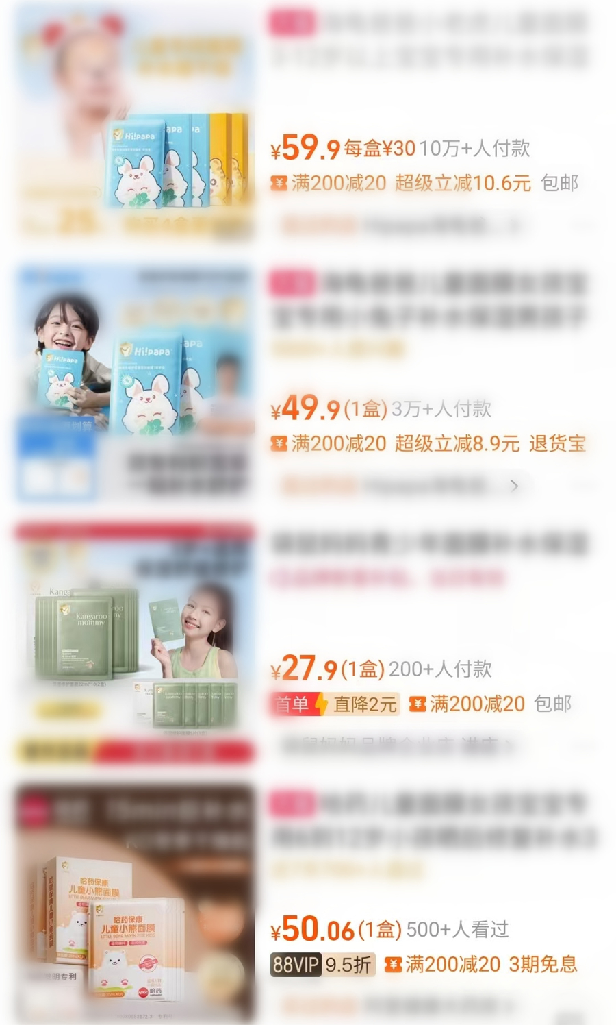近年来,儿童面膜市场正以前所未有的速度扩张。记者在电商平台搜索发现,儿童面膜种类繁多,一盒五片装的价格从几十元到数百元不等。产品不仅按肤质细致划分为干敏肌、油敏肌、油痘肌、暗沉肌等类型,甚至进一步衍生出“婴儿面膜”这一更细分的品类。